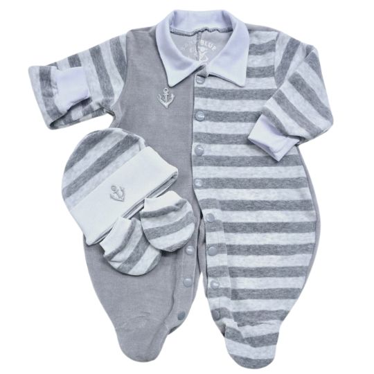 Apresentamos o Macacão em Plush da Baby Blue FOR YOU, perfeito para proporcionar conforto e estilo ao seu bebê! Com uma combinação harmoniosa de cores em cinza e listras cinza com branco, este macacão é uma escolha elegante e aconchegante.